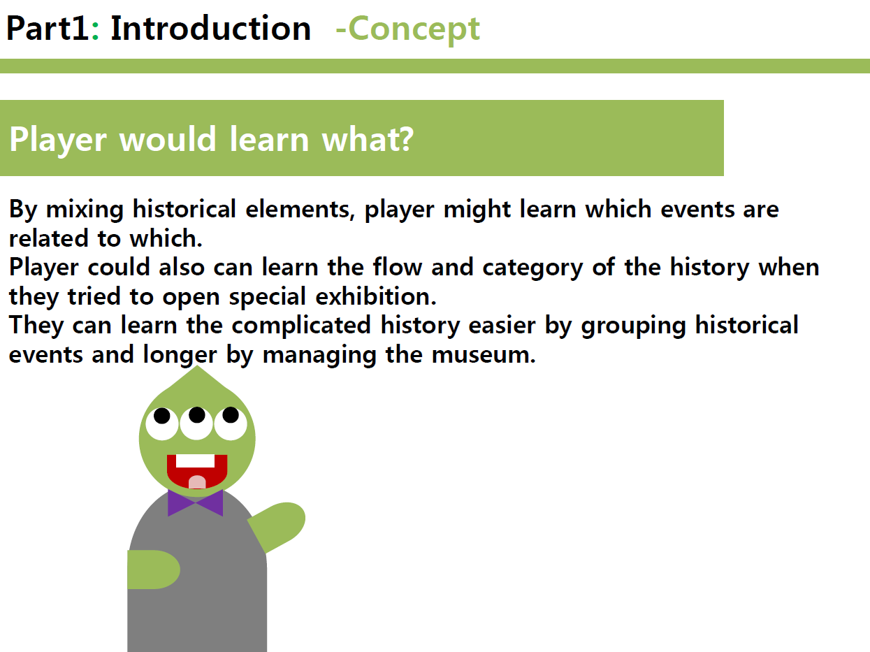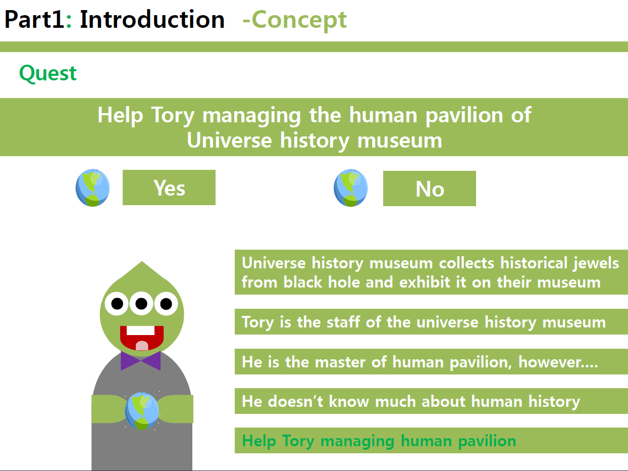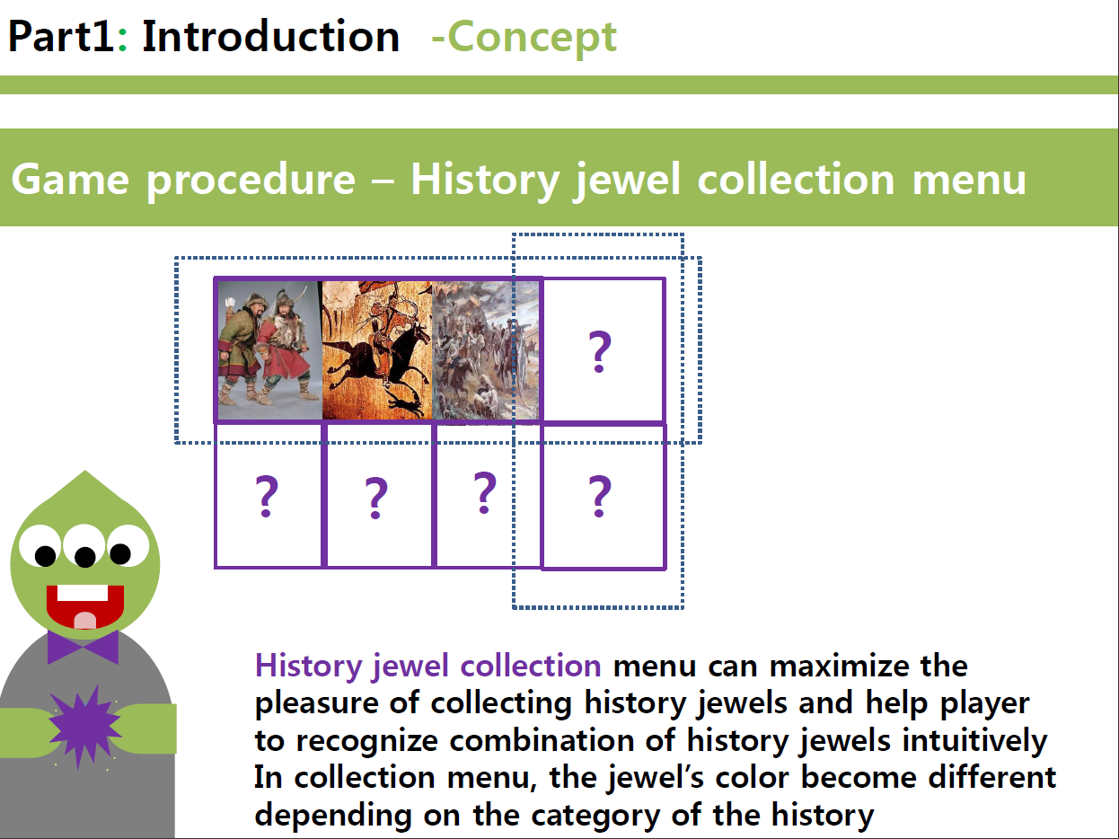- The player becomes the alien ‘Tory’ who wants to open the museum of human history. The player can collect the fraction of the historical event or the historical person as a form of the gem by playing the mini game. The player can build up the story with collected gems until he/she makes a complete story. A player can exhibit his/her own gem in the virtual museum, and the player can earn money to use it to collect more time gem.