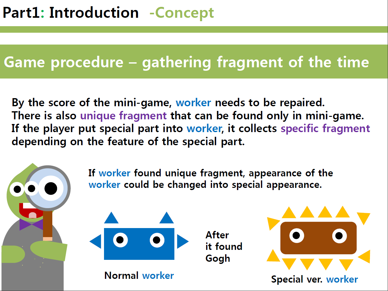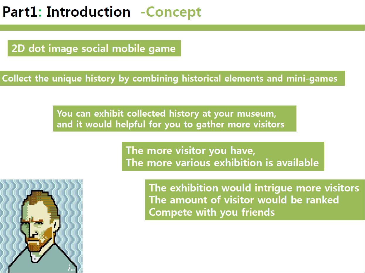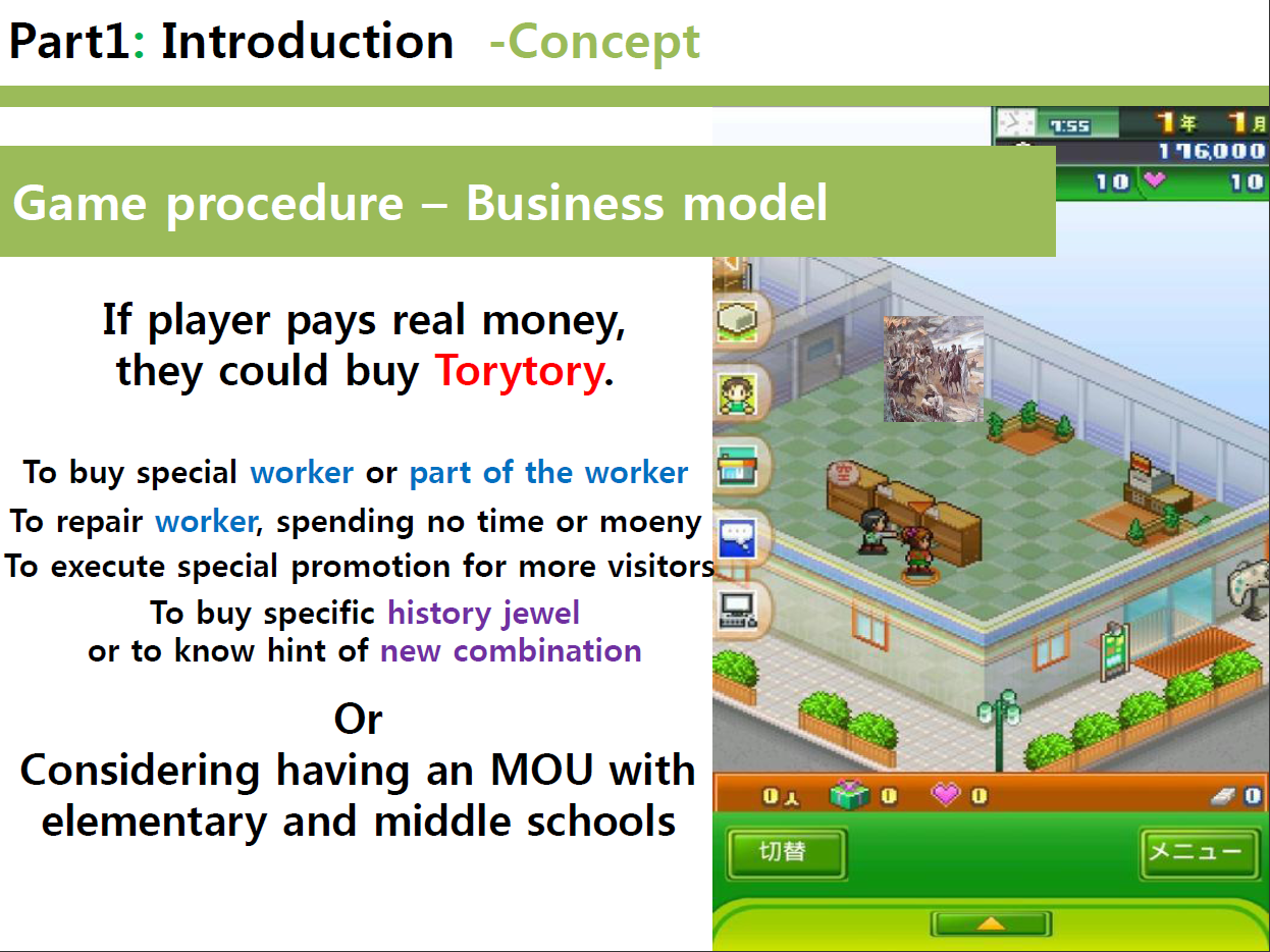 - The player becomes the alien ‘Tory’ who wants to open the museum of human history. The player can collect the fraction of the historical event or the historical person as a form of the gem by playing the mini game. The player can build up the story with collected gems until he/she makes a complete story. A player can exhibit his/her own gem in the virtual museum, and the player can earn money to use it to collect more time gem.