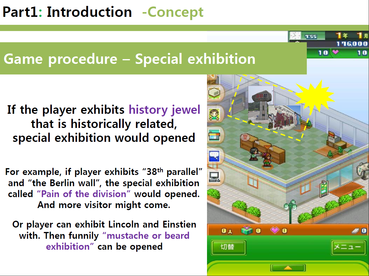 - It was an in-class project of the class ‘Edutainment design’. The game is designed to be prepared for the electronic textbook age. The game covers world historical events which are covered by public education textbooks.