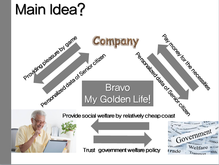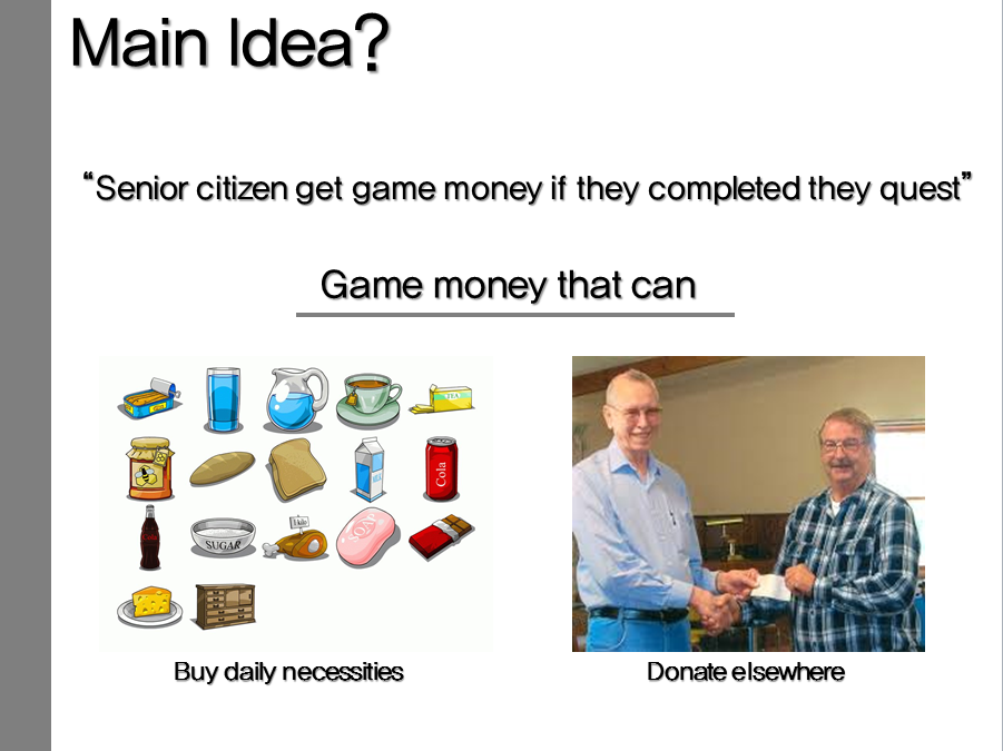 - The purpose of game is to encourage cognitive and social activity of elderly people while playing the game. The game provides player with everyday quest, and they get virtual money when quests are completed. With the virtual money, players can either buy daily necessities, or donate them. The high ranking players with good amount of donation can be recognized on TV or online media to encourage the sense of pride and participation.